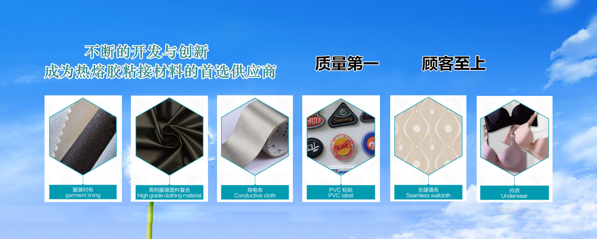 The company production of copolyamide (COPA), polyurethane (TPU), (COPES) copolyester hot-melt adhesive in textile fabric, cotton, linen, leather coating and composite product of choice. Widely used for textile printing, garment accessories, shoe accessories, filters, packaging materials,